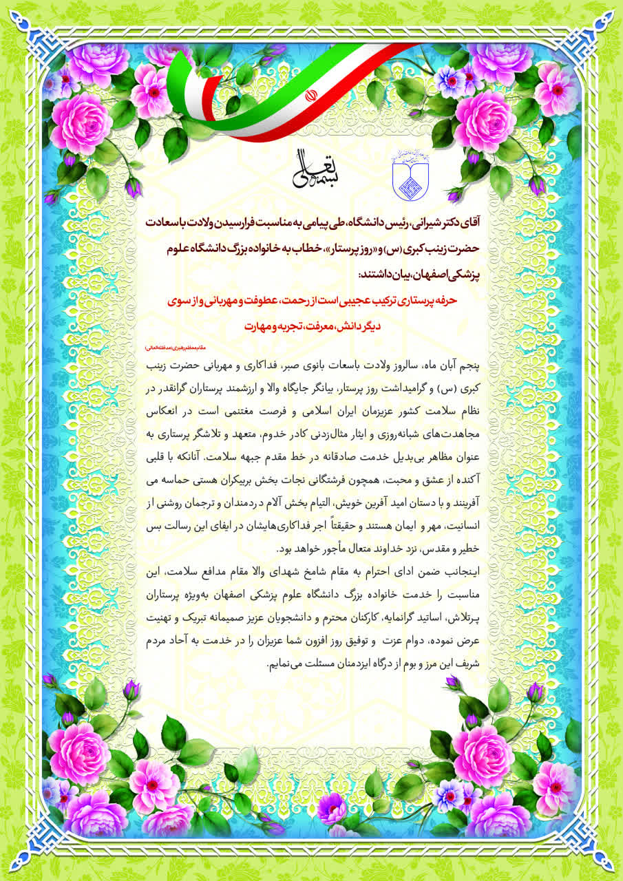 یام تبریک دکتر شیرانی رئیس دانشگاه علوم پزشکی اصفهان، به پرستاران عزیز و دلسوز